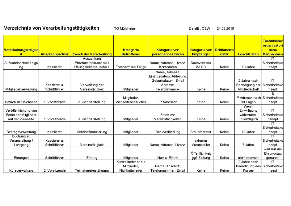 • Zum Zwecke der Übungsleiter- oder Ehrenamtspauschale werden von Übungsleitern, ehrenamtlichen Helfern und Personen im Ehrenamt der TG Mühlheim der Name, Vorname, Adresse, Geburtsdatum, Telefonnummer, Kontodaten, Lizenznummern, Zertifikate verarbeitet. Die Rechtsgrundlage hierfür ist Art. 6 Abs. lit. b) DS-GVO.